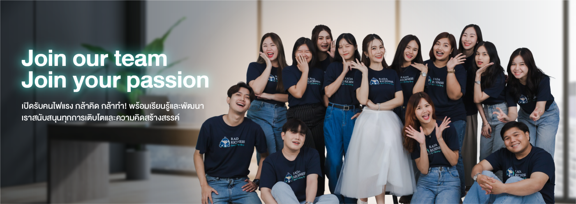 เราคือทีมคนไฟแรงที่กล้าคิด กล้าทำ พร้อมเรียนรู้และพัฒนาตัวเองอยู่เสมอ สนับสนุนทุกการเติบโตของเพื่อนร่วมงาน และเปิดพื้นที่ให้ความคิดสร้างสรรค์